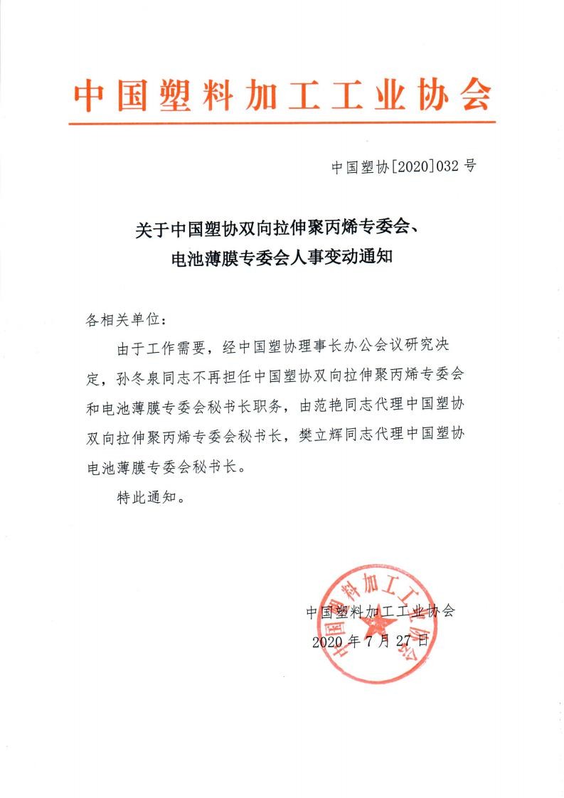 由于工作需要,经伟德投注官方网站入口理事长办公会议研究决定,孙冬泉同志不再担任伟德投注官方网站入口双向拉伸聚丙烯专委会和电池薄膜专委会秘书长职务,由范艳同志代理伟德投注官方网站入口双向拉伸聚丙烯专委会秘书长,樊立辉同志代理伟德投注官方网站入口电池薄膜专委会秘书长。