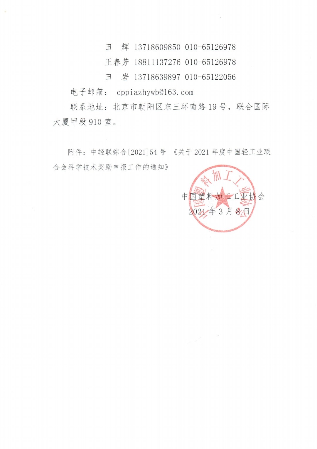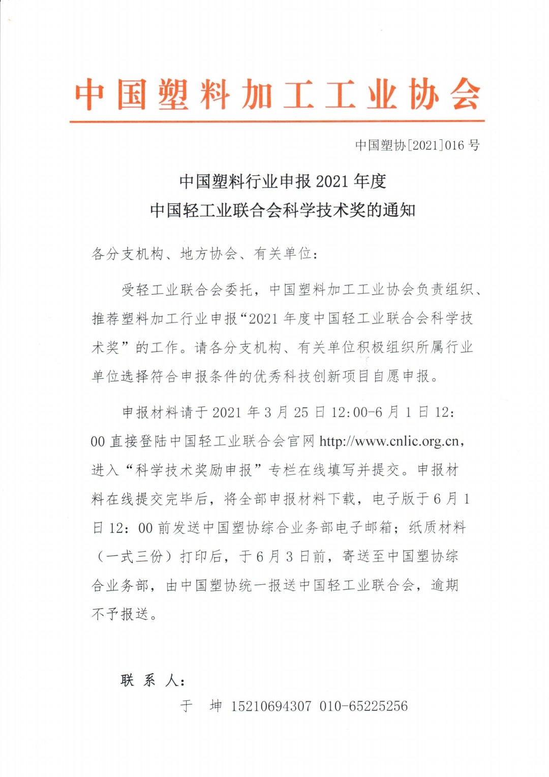 中国塑料行业申报2021年度中国轻工业联合会科学技术奖的通知
