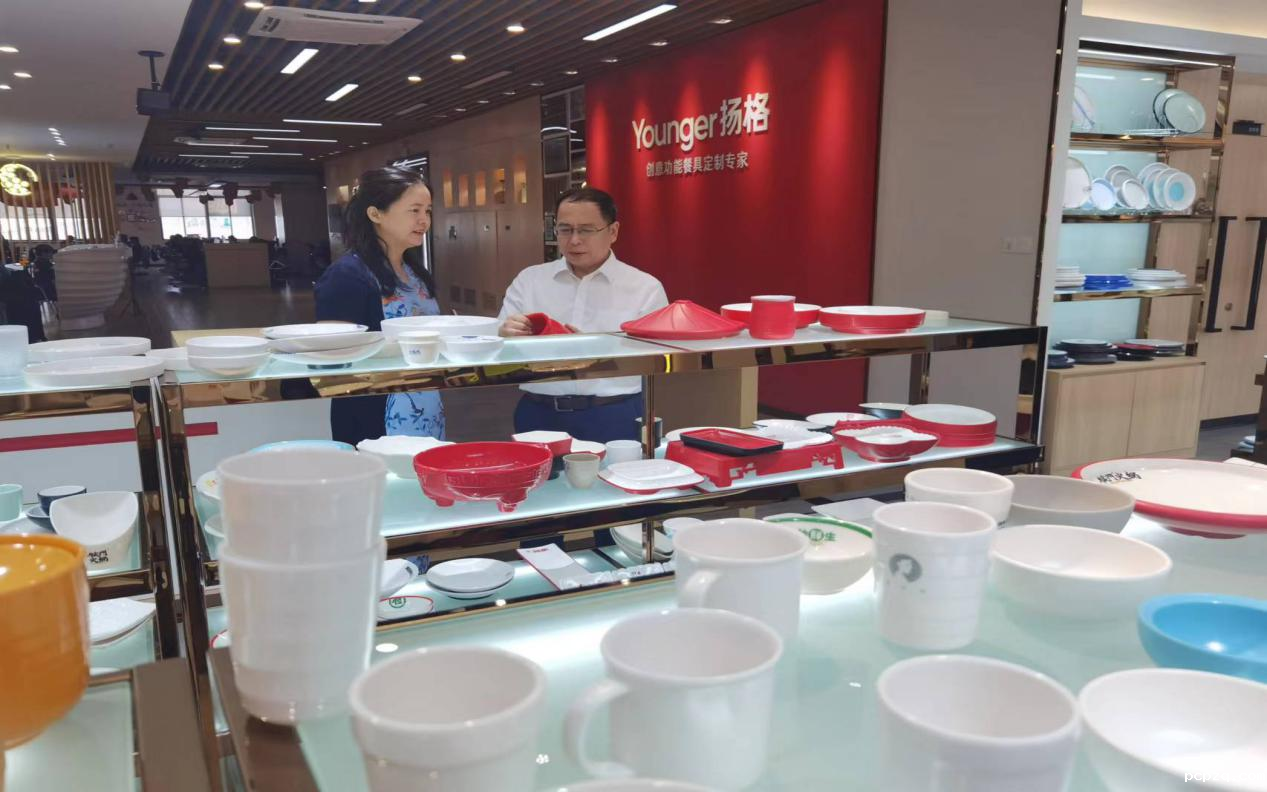 7月10日,王占杰理事长一行调研广东扬格餐具有限公司,受到了董事长张丽燕、总经理姚润高的热情接待。扬格公司创立于1998年,总部位于广州番禺,是专注密胺餐具的研发、设计、制造及销售于一体的国家认定高新科技企业。 扬格餐具主要用于餐馆、酒店等,涵盖火锅、粉面、烧烤、中餐、西餐、家居等各式餐饮风格。王理事长一行参观了产品展示厅,仔细了解了产品设计、工艺技术以及密胺制品智能化生产等情况,并进行了座谈交流。