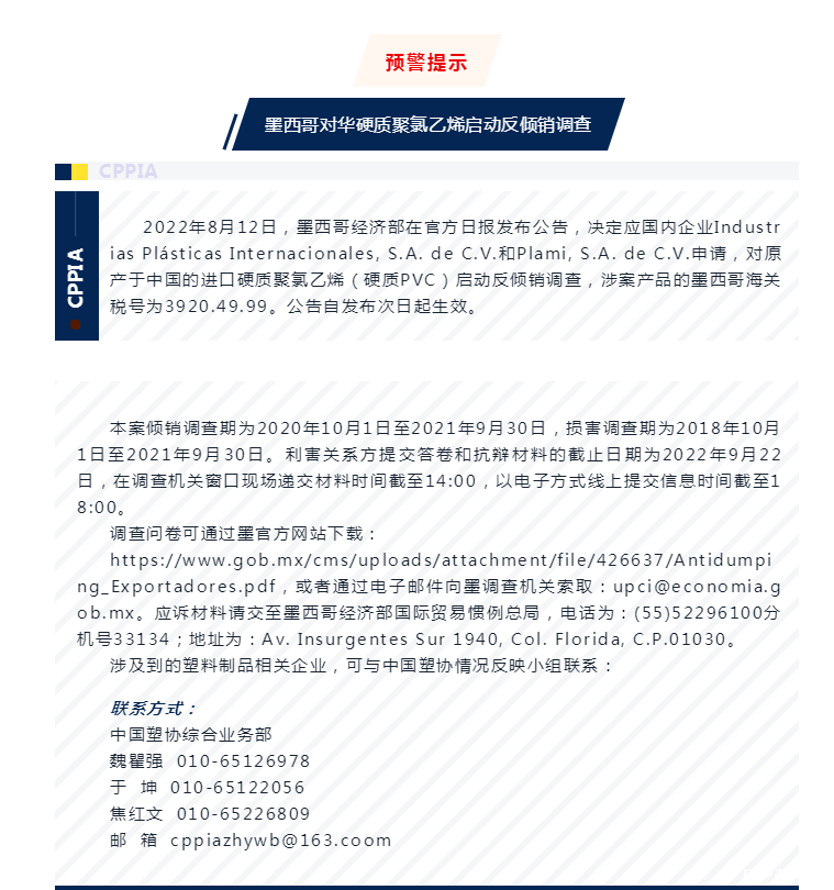 预警提示丨墨西哥对华硬质聚氯乙烯启动反倾销调查