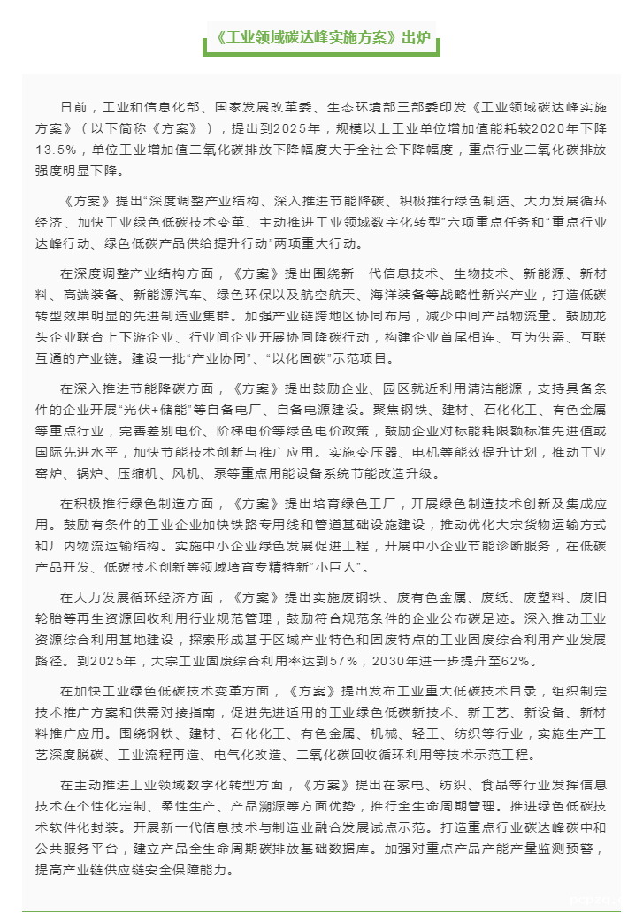 要闻 | 《工业领域碳达峰实施方案》出炉