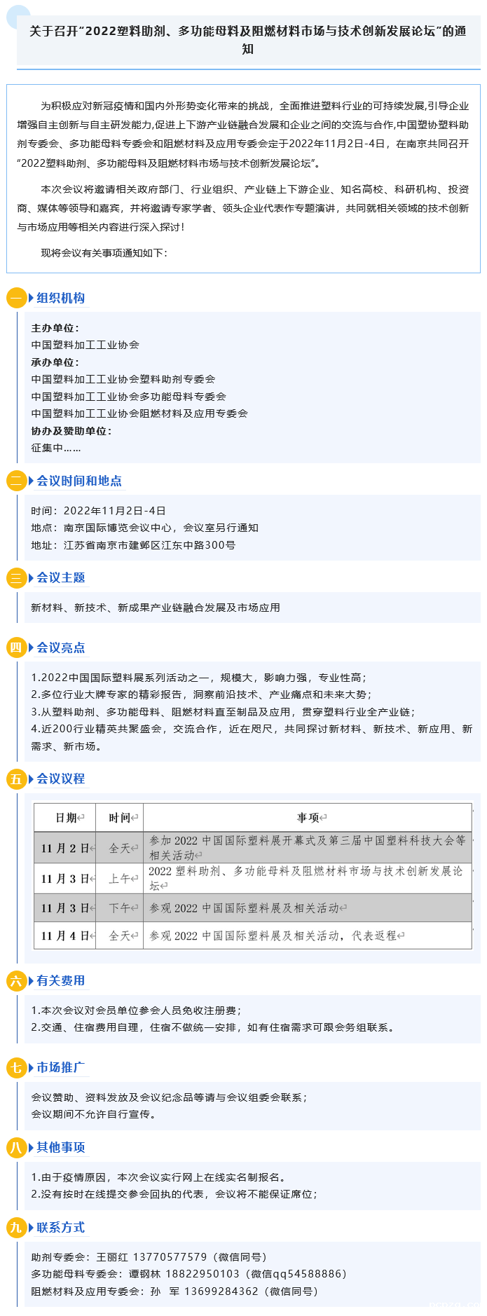 会议 | 关于召开“2022塑料助剂、多功能母料及阻燃材料市场与技术创新发展论坛”的通知