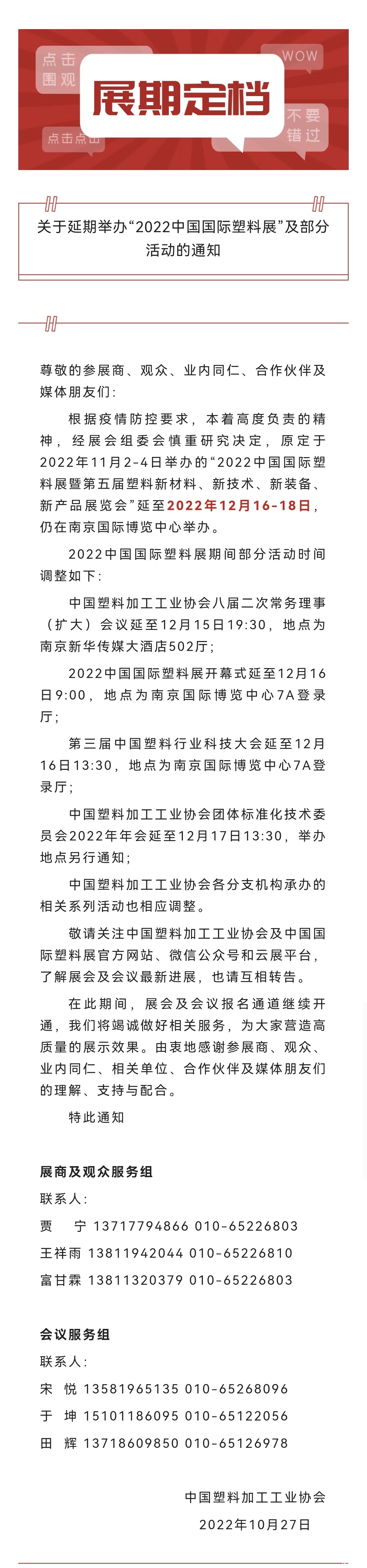 展期定档 | 关于延期举办“2022中国国际塑料展”及部分活动的通知