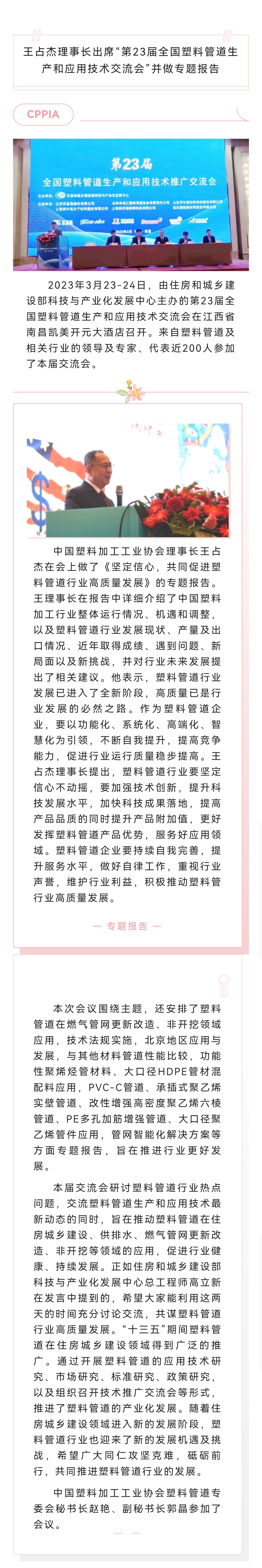 王占杰理事长出席“第23届全国塑料管道生产和应用技术交流会”并做专题报告