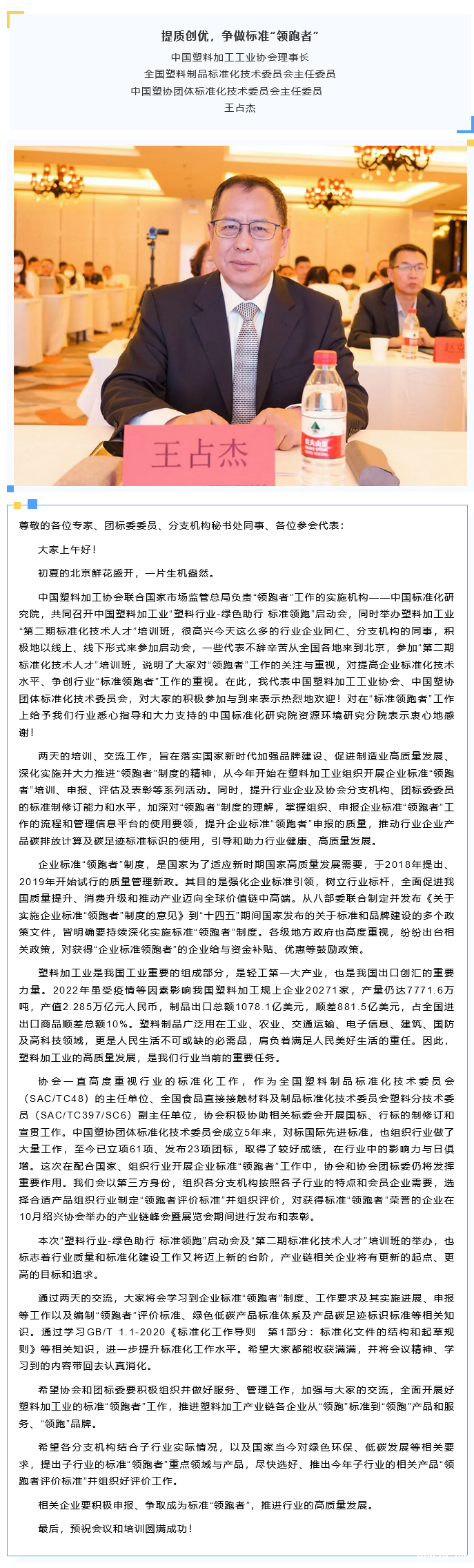王占杰理事长在betv伟德“塑料行业-绿色助行 标准领跑”启动会上的讲话