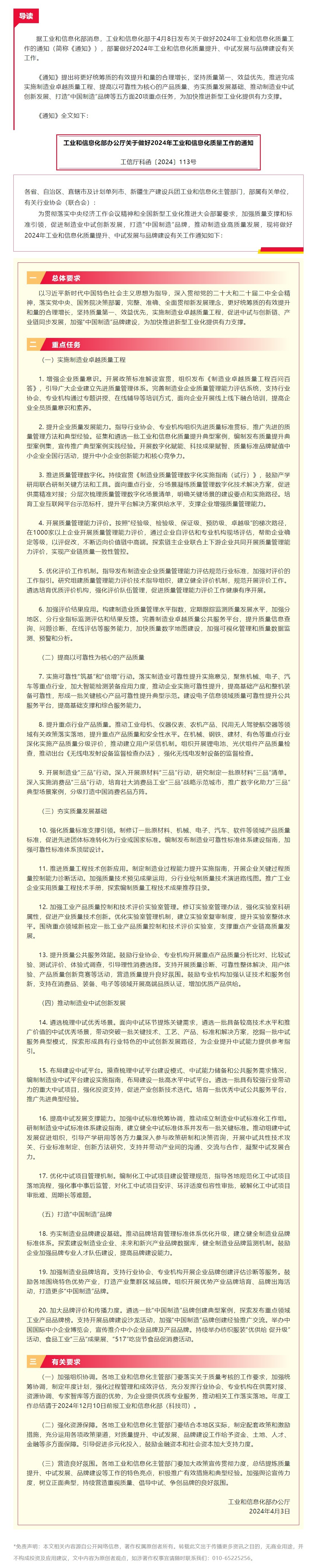 政策速递 | 工业和信息化部办公厅关于做好2024年工业和信息化质量工作的通知