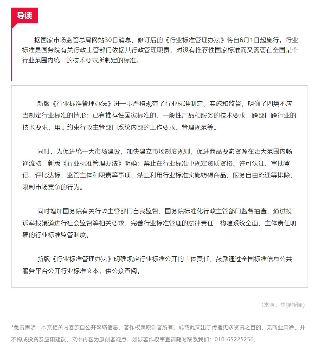 政策速递 | 新版《行业标准管理办法》6月1日起实施