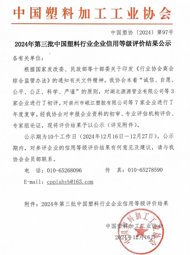 2024年第三批中国塑料行业企业信用等级评价结果公示