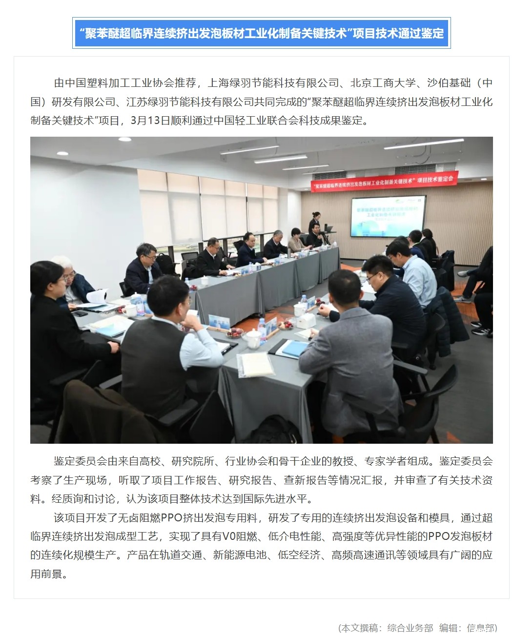 “聚苯醚超临界连续挤出发泡板材工业化制备关键技术”项目技术通过鉴定