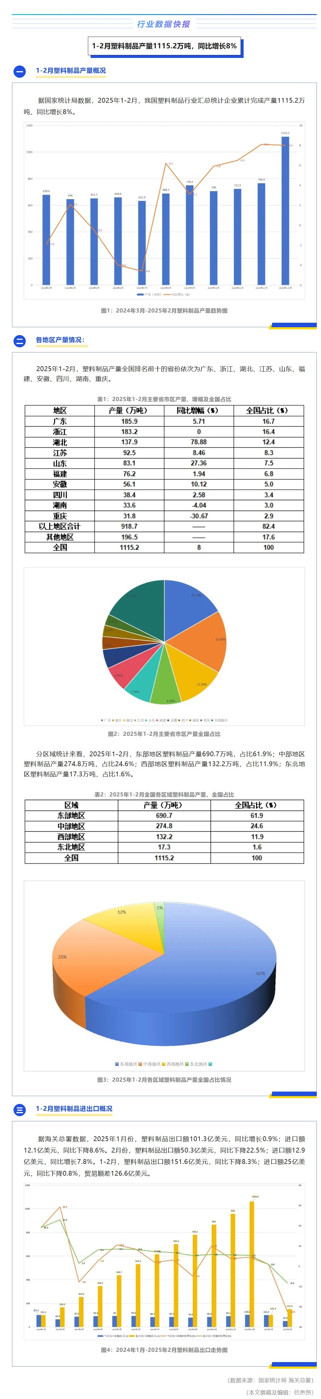 行业数据快报 | 1-2月塑料制品产量1115.2万吨,同比增长8%