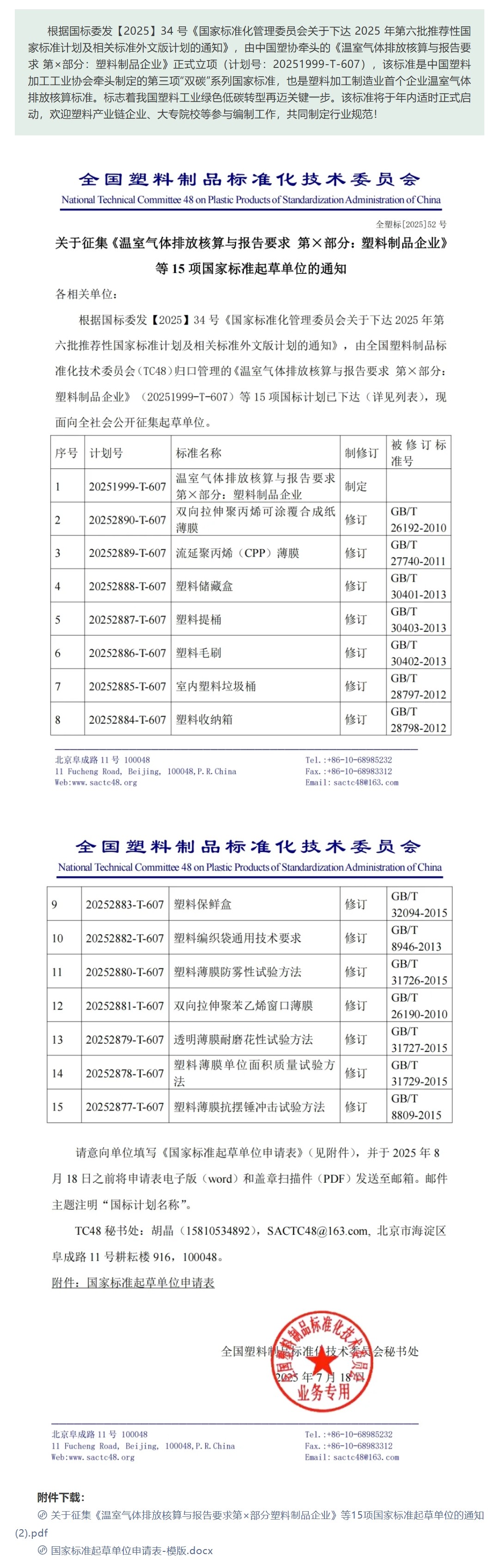 关于征集《温室气体排放核算与报告要求第×部分塑料制品企业》等15项国家标准起草单位的通知.pdf