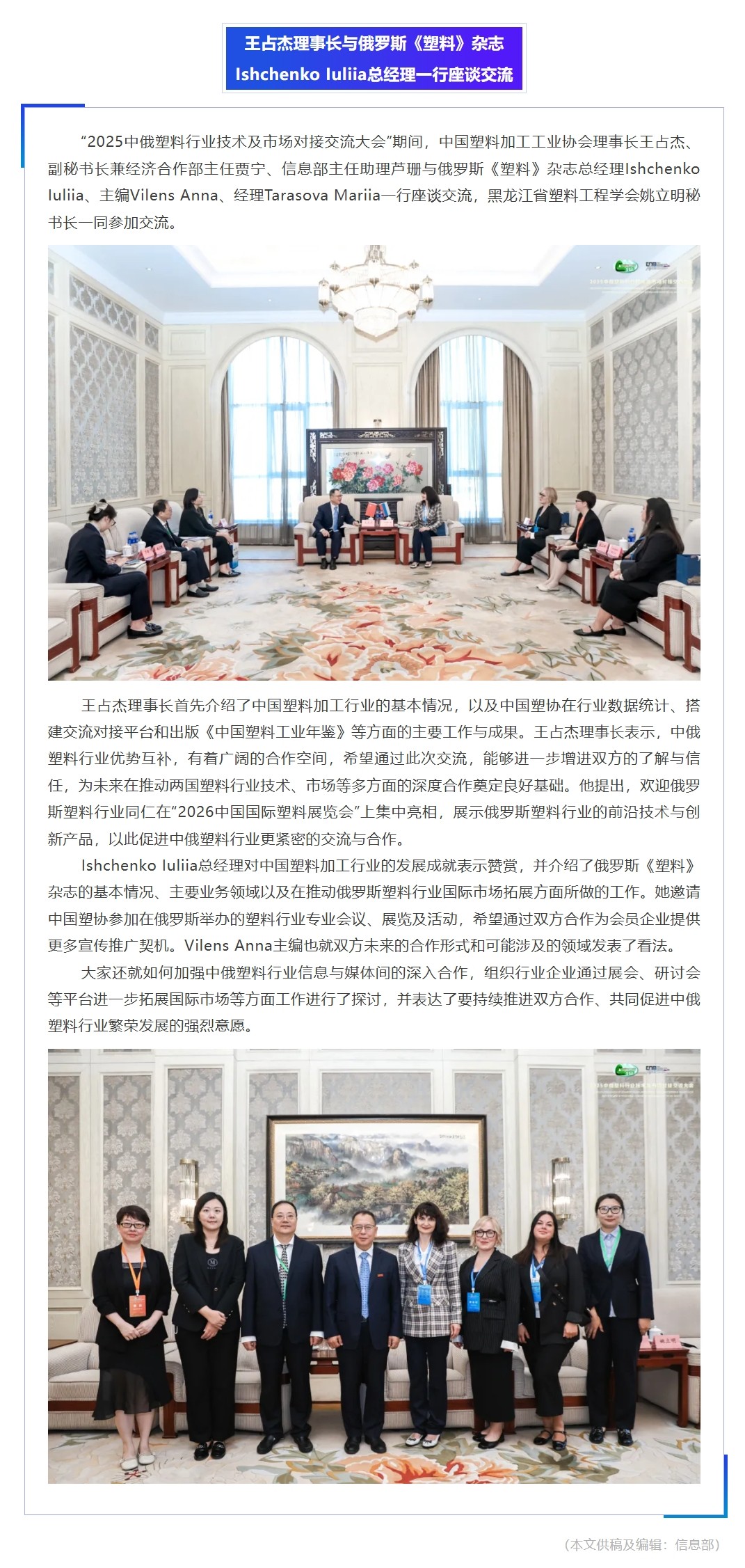 王占杰理事长与俄罗斯《塑料》杂志Ishchenko Iuliia总经理一行座谈交流